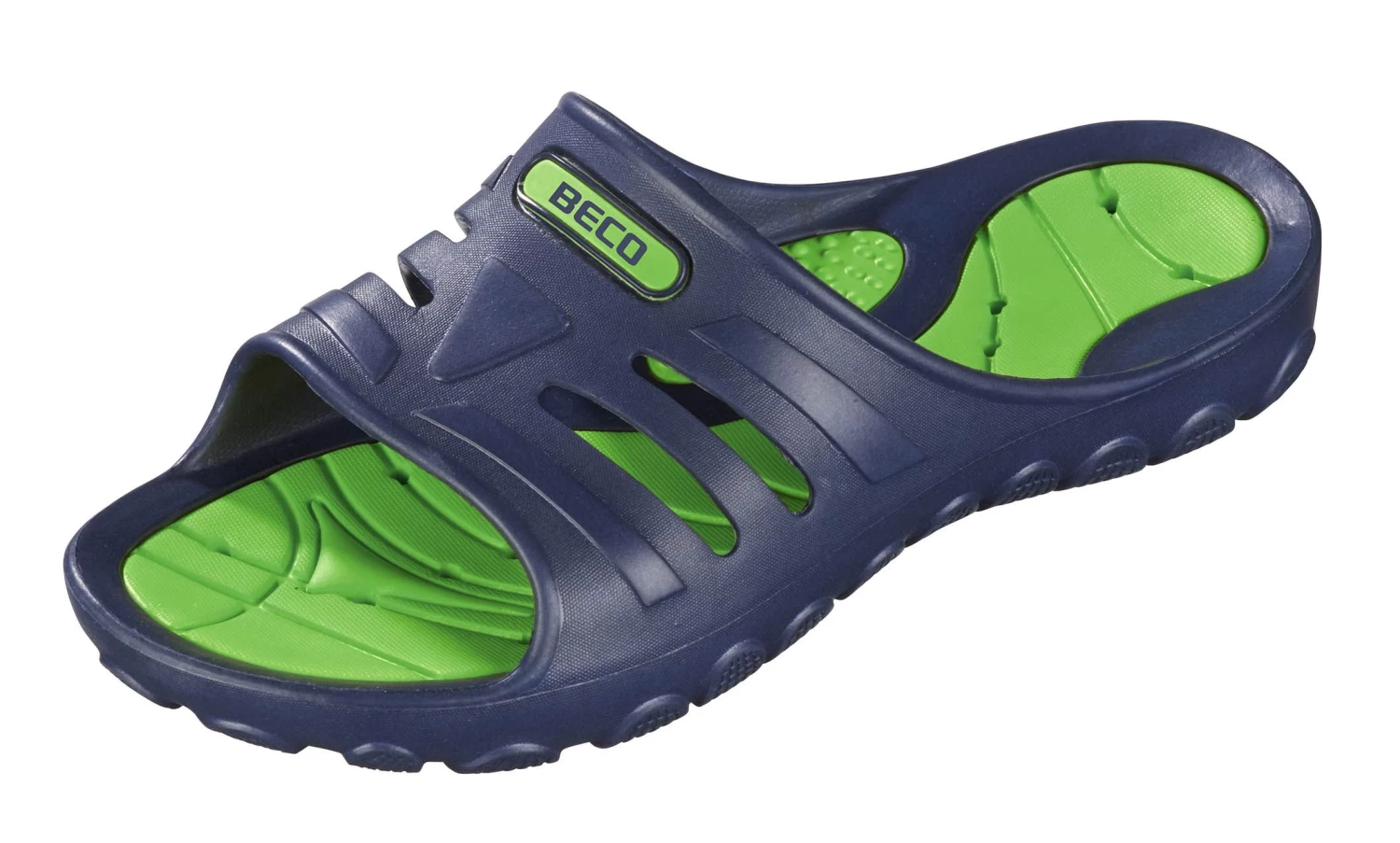 Eine Herren Pantolette für Schwimmbad und Pool. Sie verfügt über einen Wasserablauf und die Innensohle ist herausnehmbar.