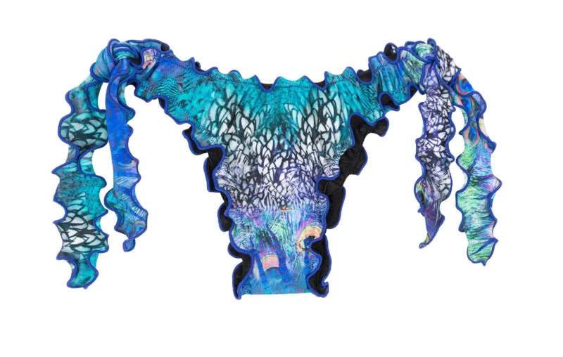 Eine brasilianische Bikinihose mit gewelltem Rand, Pfauenaugenmotiv von Rio de Sol. Typisch brasilianisch geschnitten, mit gewellten Rand und seitlichen Schnüren. Stellen Sie sich jetzt Ihren blauen brasilianischen Bikini mit Pfaumotiv zusammen. Bikiniteile mit der gleichen Pfau-Musterung finden Sie in der Serie Violina.