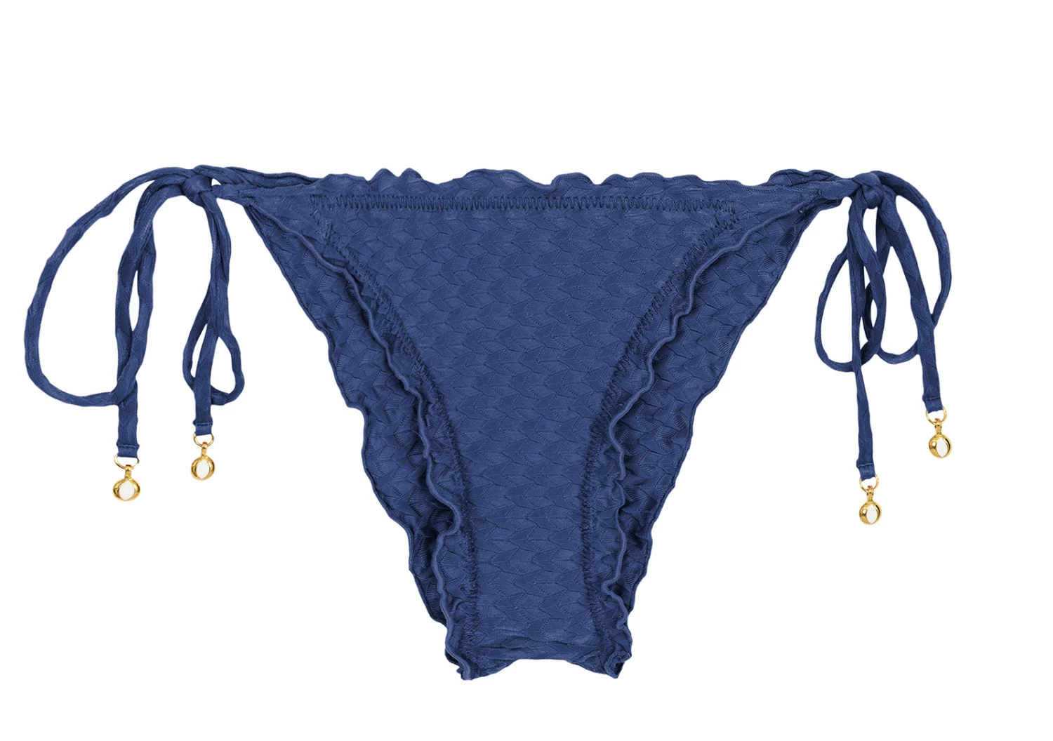 Eine blau texturierte Scrunch Bikinihose von Rio de Sol. Diese texturierte Bikinihose hat seitliche Schnüre, welche mit Accessoires bestückt sind. Der Rand dieses Bottoms ist gewellt und lässt ihren Körper noch graziöser aussehen. Ein farbgleiches Bikini-Top finden sie in unserer Bikiniserie Kiwanda Denim. Alle hier erhältlichen navyblauen Bikiniteile sind ebenfalls texturiert und in verschiedenen Schnittmustern vorhanden. Tragen sie an ihren Strand einen Bikini der einmalig sein wird.