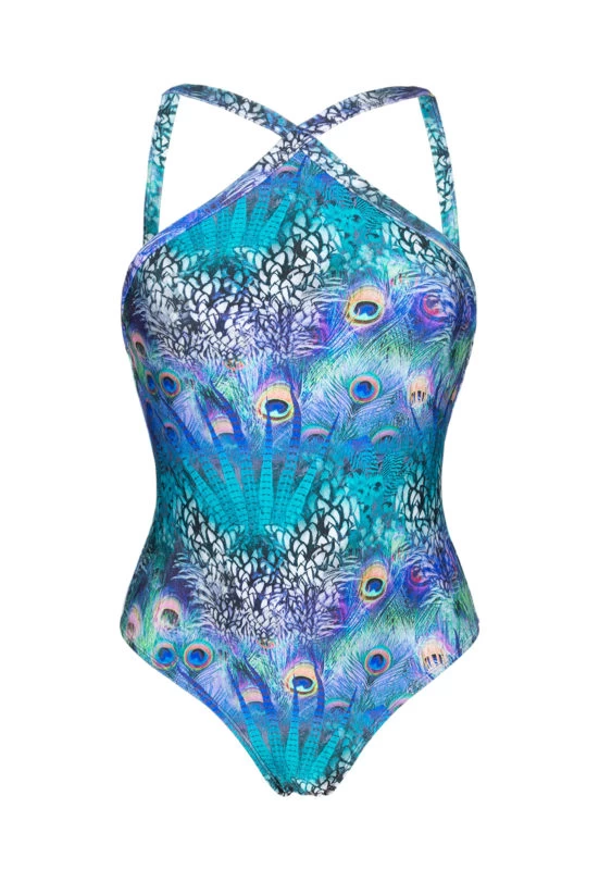 Blaugemusterter hochgeschlossener Badeanzug von Rio de Sol. Dieser typisch brasilianisch geschnittene Badeanzug mit Pfauenmotiv hat ein hochgeschlossenes Dekolletee und ist unwattiert. Ideal auch für sportliche betätigungen im Wasser. Gleiche Motive für einen Bikini finden Sie in der serie Violina.