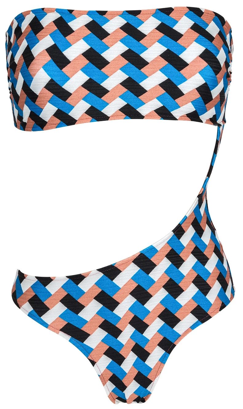 Ein brasilianischer bunter Monokini von Rio de Sol. Die Wattierung des trägerlosen Oberteils lässt sich entfernen. Das Höschen ist typisch brasilianisch geschnitten. Beide werden auf nur einer Seite von einem Band gehalten. Hierzu passend ist auch unsere Strandkollektion Geometric. In der gleichen Musterung finden sie hier Bikiniteile für ihre eigene Bikini-Kreation.