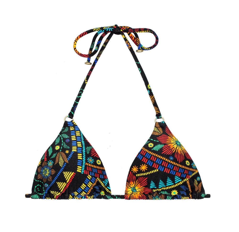 Buntes Triangeltop mit Motiven aus der Kollektion 2018 von Rio de Sol. Dieses Bikini-Oberteil hat eine entfernbare Wattierung, entscheiden Sie selbst wie Sie dieses tragen wollen. Es hat eine sehr auffällige Musterung auf schwarzen Hintergrund. Dieses preiswerte Bikini-Top wird Ihnen in jedem Falle stehen. Kombinieren Sie dieses jetzt mit einer Bikini-Hose aus der serie BORDADO und Sie erhalten einen perfekten Bikini aus der Kollektion 2018.