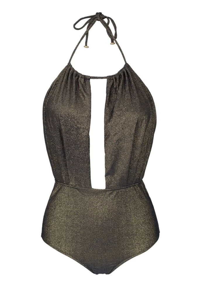 Einteiliger ausgeschnittener Badeanzug schwarz von Rio de Sol. Das Oberteil ist unwattiert und in der Mitte ausgeschnitten. Die gold-schwarze Farbe hinterlässt einen schicken Glanzeffekt. Weitere gleichfarbige Badeanzüge und Bikiniteile (auch zum kombinieren) finden Sie in der Serie RADIANTE.