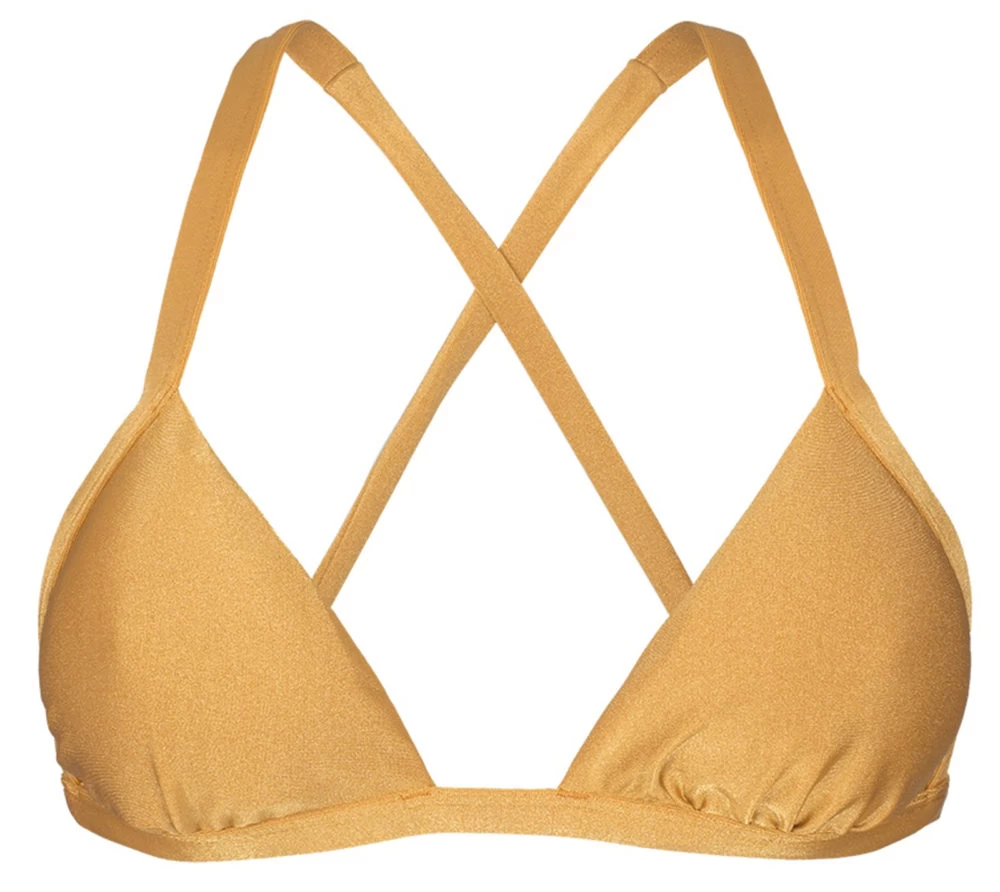 Fixiertes Brasil Triangel Top gold von Rio de Sol. Die Wattierung lässt sich entfernen, Sie entscheiden wie Sie dieses Bikini-Top tragen wollen. Für den perfekten goldenen Bikini können Sie dieses Bikinioberteil mit einem Bikini-Höschen aus der Serie Gold von Rio de Sol zusammenstellen.
