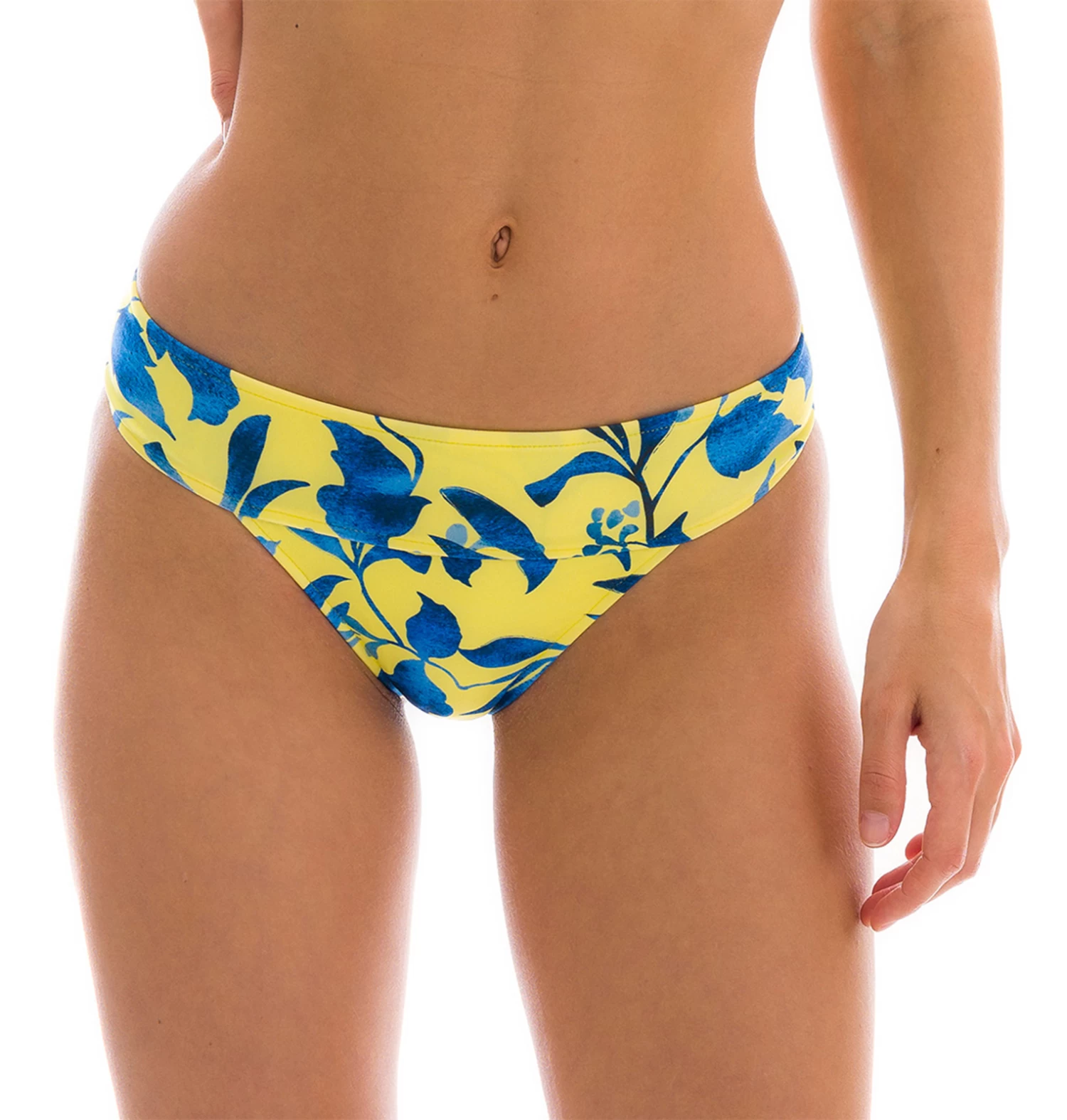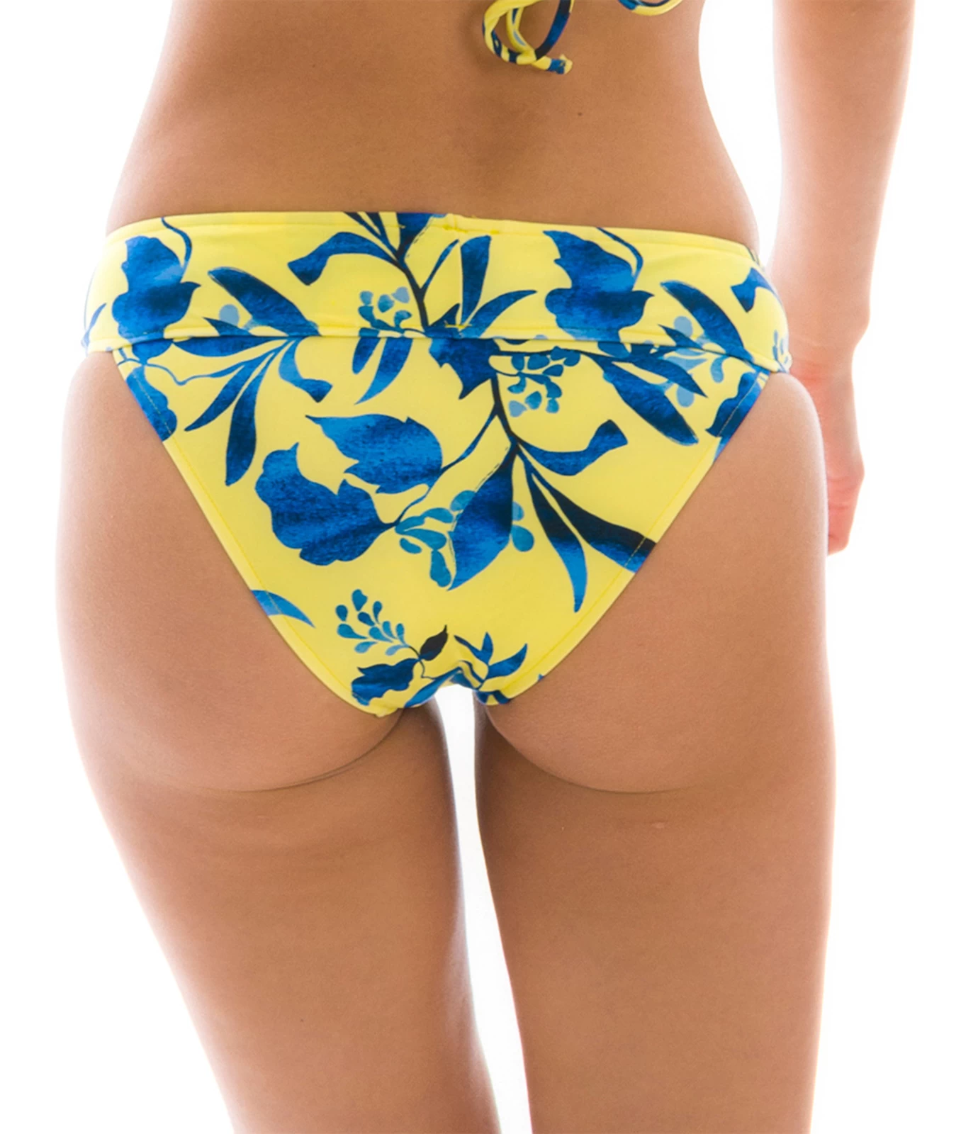 Eine gelbe Bikinihihose mit blauer Musterung von Rio de Sol. Diese gemusterte Bikinihose ist mit einem hohen Band für den sicheren Halt versehen. Ein farb- und mustergleiches Bikini-Top finden sie in unserer Bikiniserie Lemon Flower. Alle hier erhältlichen gelb-blauen Bikiniteile sind in verschiedenen Schnittmustern vorhanden und lassen sich zu einem gelben Bikini mit blauer Blümchen-Musterung kreieren. Tragen sie an ihren Strand einen Bikini der einmalig sein wird.