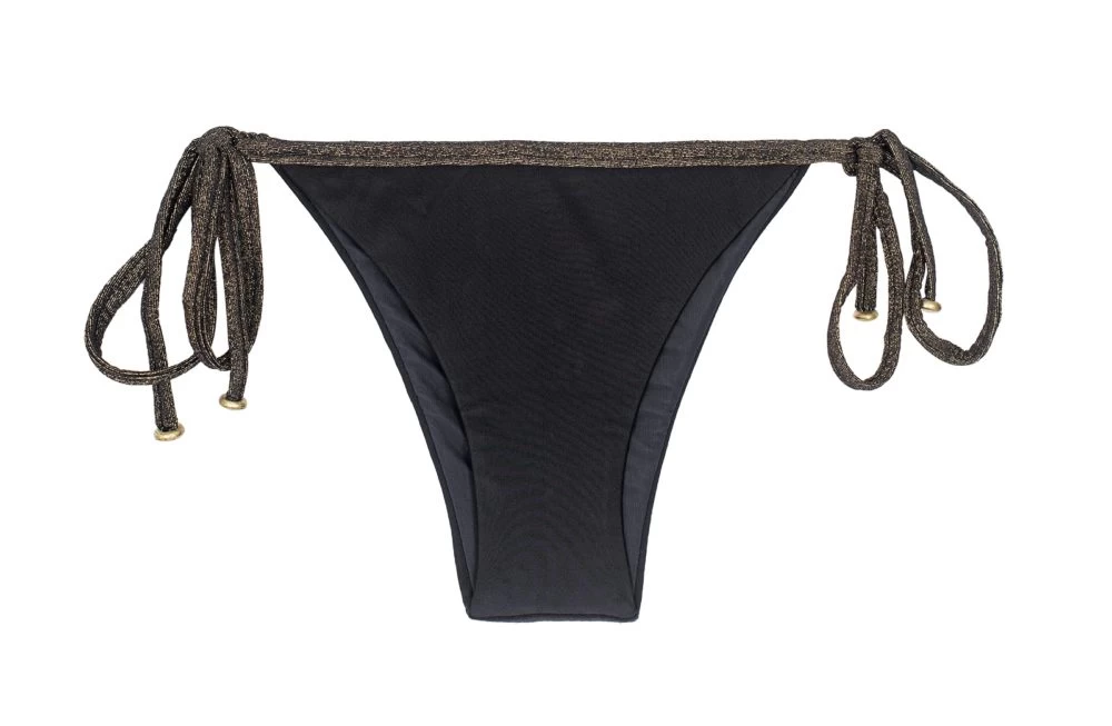 Schwarzes brasilianisches Bikinihöschen Lurex von Rio de Sol. Die seitlichen Schnüre sind typisch brasilianisch und die Farbe hat einen dezenten Glanzeffekt. Kombinieren Sie jetzt diesen Bikinislip mit einem gleichfarbigen Bikini-Oberteil aus der Rio de Sol Serie RADIANTE.