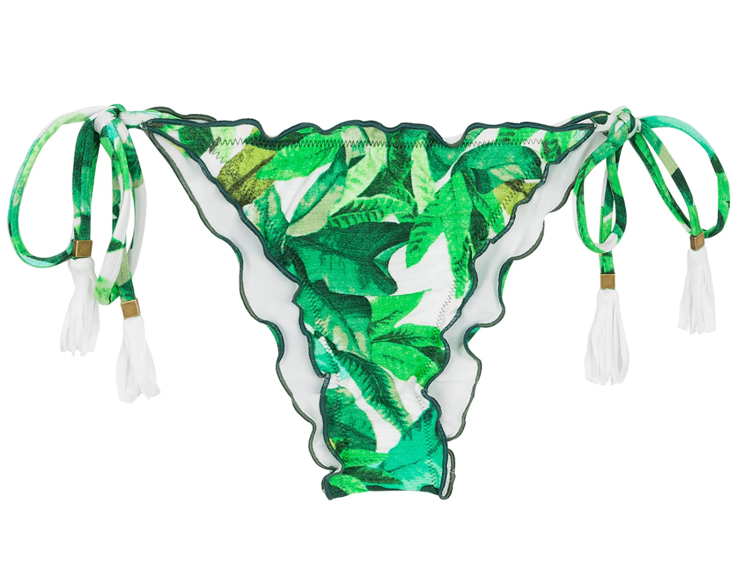 Ein Scrunch Bikiniunterteil mit Blättermuster von Rio de Sol. Dieses Bikinihöschen hat ein tropisches Blättermuster auf weißen Hintergrund. Die Ränder sind gewellt. Die seitlichen Schnüre haben auslaufende weiße Pompons. Das passende Bikinioberteil finden sie in der Bikini-Kollektion Folhagem Fufru.