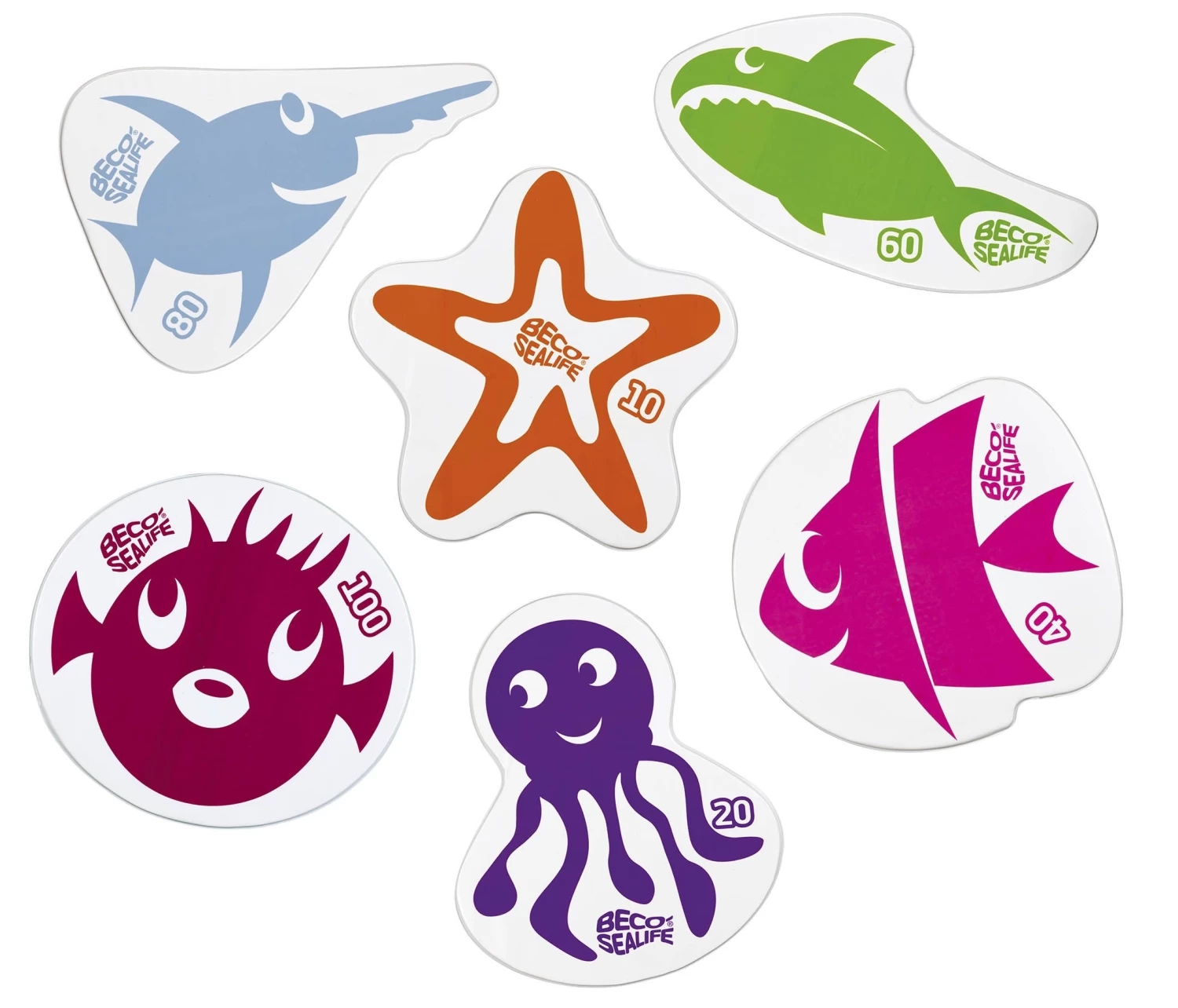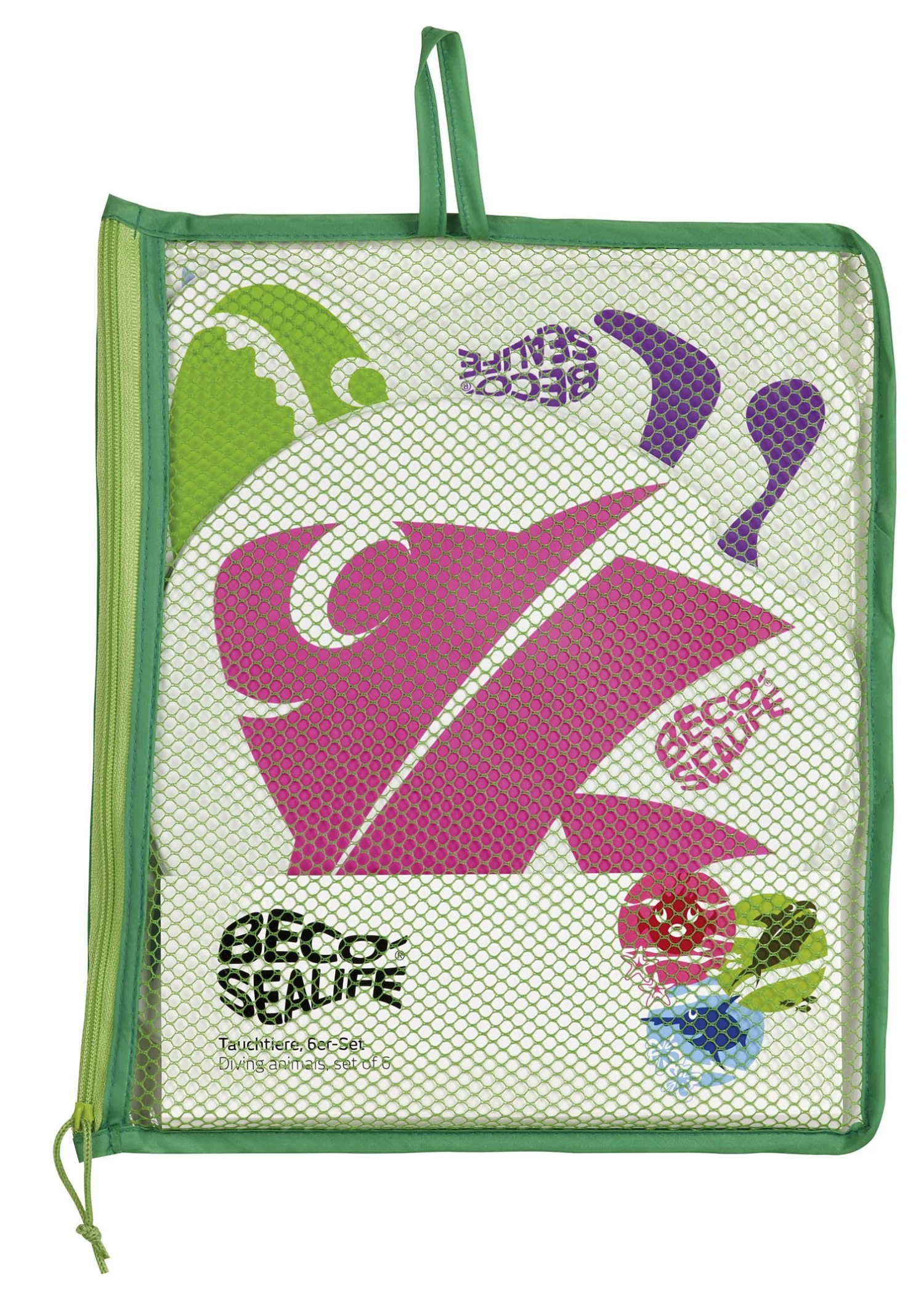 Das Tauchset bringt Farbe ins Wasser. Sechs bunte Meeresbewohner sollen vor allem Kinder motivieren zu tauchen. Die Tiere haben einen robusten Kunststoffüberzug und werden in einer Netztasche mit Reißverschluss geliefert. So gut verpackt purzeln sie an Land nicht durch die Schwimmtasche.