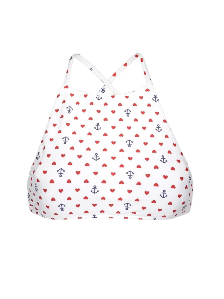 Weißes Crop Top mit Motiv. Sie lieben den Strand und das Wasser? Dann ist dieses Crop-Top mit Herz- und Ankermotiv genau das richtige sportliche Bikini-Oberteil für Sie.